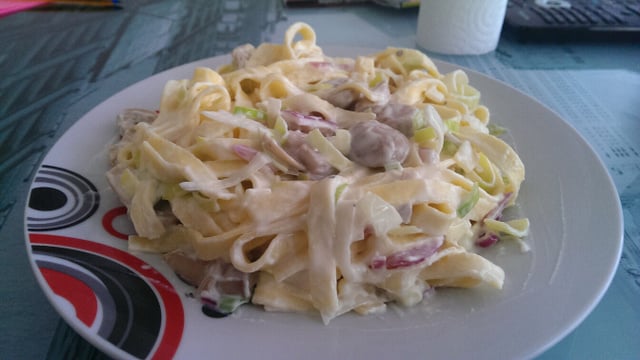 Tagliatelles accompagnées d'une sauce à la crème fraîche, champignons et poireaux.
