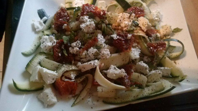 Déposer dans un plat vos tagliatelles, tomates, pignons et féta.
