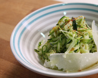 Laver puis sécher les courgettes, découper en fines lamelles avec une mandoline et les déposer dans un plat allant au four. Ajouter un beau filet d'huile d’olive et assaisonner de cumin. Mélanger. Enfourner à 100°C en vapeur intense pendant 10 min.