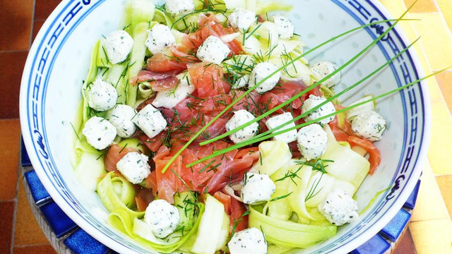Avant le repas, ajoutez le saumon fumé coupé en lamelles, l'aneth ciselée, et les boules de fromages