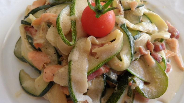 Faire chauffer un peu d'huile d'olive dans une poêle et y faire dorer les lardons, puis ajouter les tagliatelles de courgettes, faire cuire 5 min à feu doux en remuant de temps en temps.