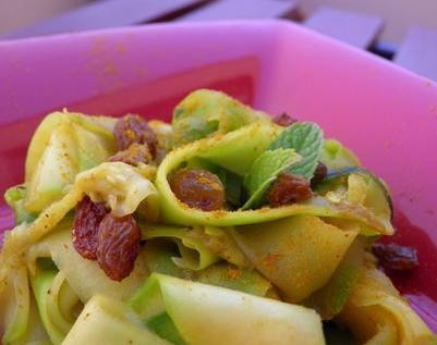 Tailler les courgettes en forme de tagliatelles, à l'aide d'un économe.Les faire revenir 8 minutes à feu moyen, dans 1CS d'huile d'olive.Ajouter les raisins et les épices. Servir avec quelques feuilles de menthe fraîche. Saler, poivrer. Réserver au frais.