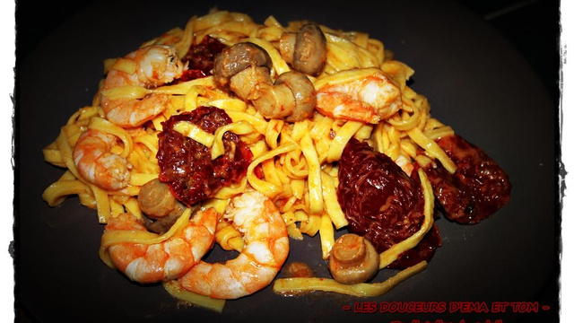 Une fois les pâtes cuites, les égoutter, puis les mélanger avec la sauce et rajouter les tomates séchées entières.