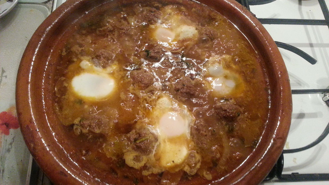 Tajine marocain avec de la viande hachée épicée et des oeufs au plat.