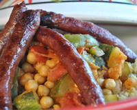 Dans un plat à tajine, déposer au fond la semoule, les légumes puis les merguez.