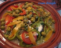 Dans le tajine, mettez l'huile et disposez le poisson, les rondelles de tomates, le poivron, l'ail écrasé. le citron confit coupé en petits quartiers (ôtez la pulpe), les olives, le poivre, le cumin.