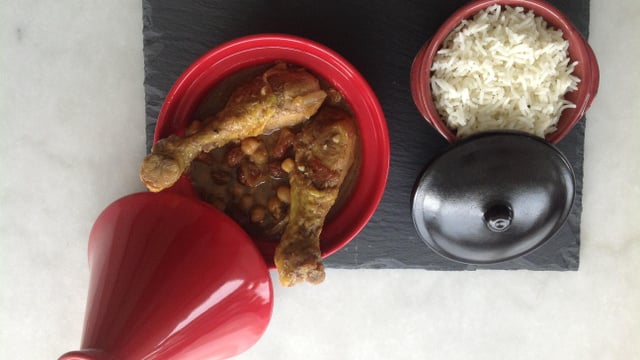 Chauffer jusqu'à une légère ébullition. Verser le tout dans un tajine électrique et laisser mijoter pendant 1/2 heure à puissance maximale puis 1/2 heure à puissance faible.