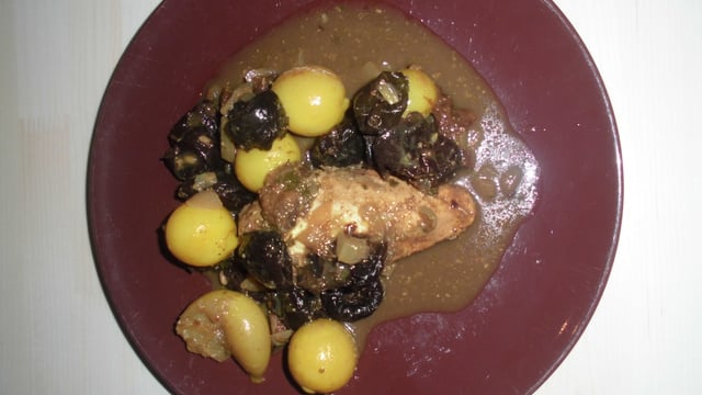 Mettre les blancs de poulet dans la cocote et y ajouter la préparation aux pruneaux.