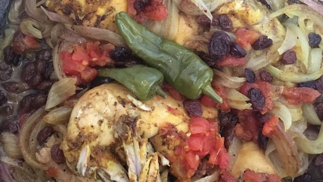 Hacher un oignon et couper les 2 autres oignons en lamelles. Eplucher et épépiner la tomate et couper la en petits dès. Couper le poulet en 4. Mélanger toutes les épices dans un bol et réserver. Mettre les raisins secs dans l'eau et réserver.