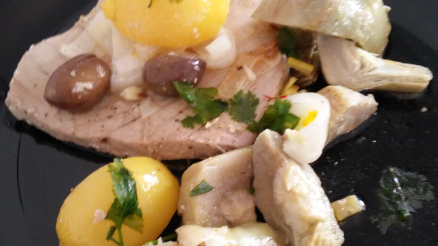 Mettre le tout (sauf les olives et la coriandre) dans un tajine, ajouter éventuellement un peu d'eau, couvrir et laisser mijoter 20 minutes à feu doux. Avant de servir ajouter les olives et la coriandre..