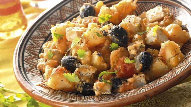Incorporer alors les tomates, le cumin, la coriandre ciselée, le gingembre, le piment, le bouquet garni et laisser mijoter 15 mn. Verser la farine, mélanger et ajouter les pommes de terre cuites, les olives et un verre d'eau.