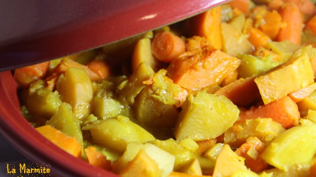 Si vous utilisez une cocotte au lieu d'un vrai plat à tajine, incorporez les pommes de terre en même temps que le potimarron ;-)