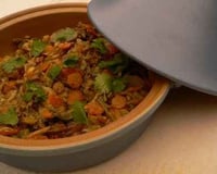 - 3Ajouter les queues de la botte de coriandre coupées fines,le citron confit en cubes, le miel, les épices, le sel et le piment. Cuire à couvert à feu très doux ou au four avec le couvercle du plat à tajine pendant 1 heure à 140°C.