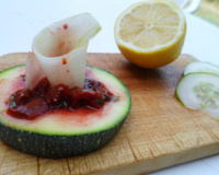 Découpez le kaki en petits cubes et posez-les sur cette lamelle.