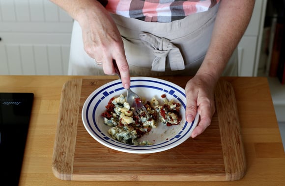 8Mettez le fromage dans une assiette creuse avec les 3/4 des tomates séchées et écrasez à la fourchette.