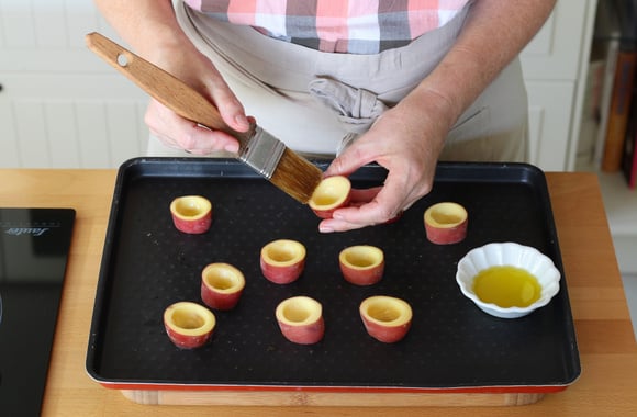 4Badigeonnez les tronçons avec de l'huile d'olive et déposez-les sur une plaque de cuisson. Enfournez à 200°C (th.6/7) pour 15 à 20 minutes et vérifiez la cuisson des pommes de terre en les piquant avec la pointe d'un couteau.