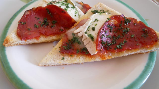 Sur chaque portion de pain, disposer deux rondelles de chorizo et une de fromage de chèvre. Saupoudrer de persil. - 4