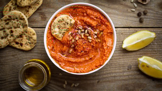 Idéale pour l'apéro, cette crème de poivrons s'étale sur des petits morceaux de pain mais on peut aussi la servir comme dip dans laquelle on va tremper des gressins ou des légumes crus.