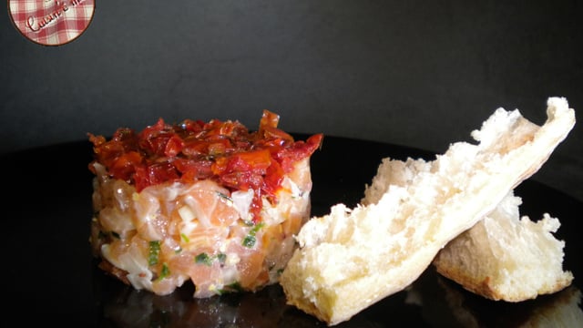 Commencez par taillez finement vos deux saumons, puis ajoutez l'huile, la moutarde, la ciboulette et l'oignon