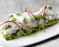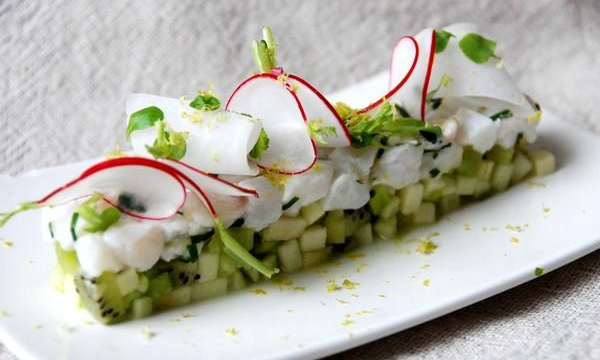 Cabillaud cuit dans un jus de citron vert, adouci par le kiwi et la pomme