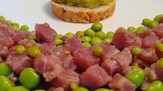 Dressez en assiette creuse une couche de purée de petits pois. Ajouter ensuite le tartare de canard en forme de cercle sur la purée et déposer une pointe de couteau de wasabi sur le tout.( Attention au dosage du wasabi, celui ci est très fort en goût)