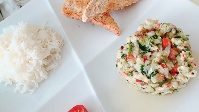 Couper en petits dés avec un couteau inox les filets de daurade.