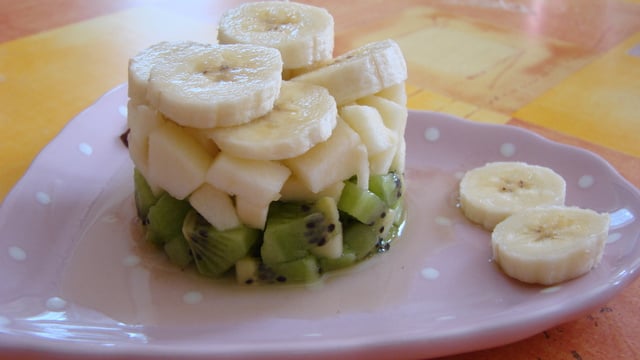 Installer les ronds à pâtisserie sur les assiettes de service. Commencer par un étage de kiwis puis finir par l'étage de bananes. Disposer 5 rondelles au-dessus de chaque préparation et 2 rondelles sur l'assiette. Retirer délicatement le rond à pâtisserie. Réserver au minimum 1h30 au réfrigérateur. Sortir au moment de servir, essuyer les assiettes car il se peut que les kiwis rendent un peu de jus. Bon appétit!