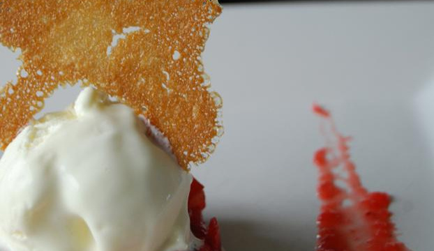 La gariguette se retrouve ici sous deux formes : en dés et en coulis. Elle est sublimée avec une gousse de vanille et une crème glacée délicatement parfumée à l'huile d'olive.