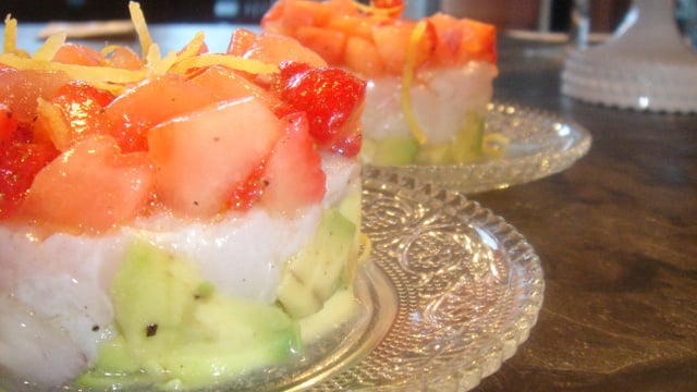 Montez les tartares dans des cercles, posez d'abord une couche d'avocat, puis de poisson et terminez en mélangez fraise et pastèque. Tassez, éparpillez les zestes de citron et servez.