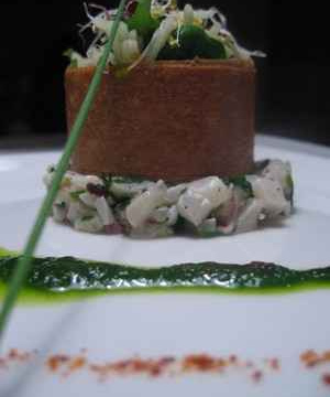 - 5Dresser dans un cercle en inox le tartare de Saint-Jacques bien égoutté.