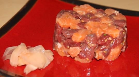 Un délicieux tartare à servir en entrée, Original, frais, et qui marie à merveille la viande et le poisson.