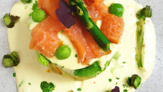 Saumon haché servi avec un siphon d'asperges et crême