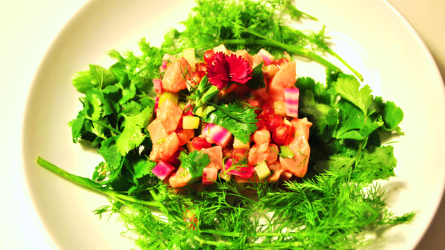 Alliant saumon frais et fumés, de jolis légumes croquants et un parfum d'asie.