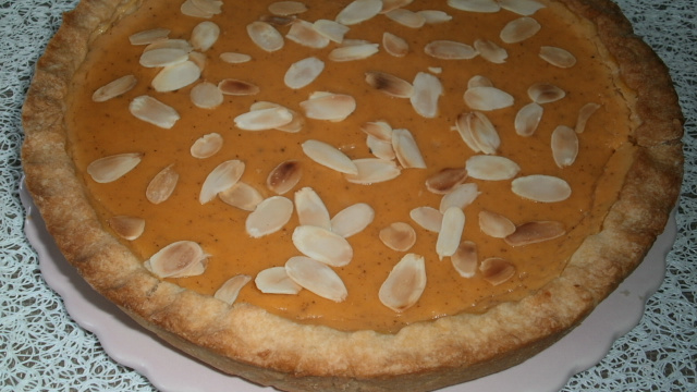 Il est préférable d'attendre que la tarte refroidisse et la mettre au frais afin qu'elle se solidifie elle n'en sera que meilleure. Aussi, mettre les amandes effilées au dernier moment pour ne pas qu'elles se ramollissent.