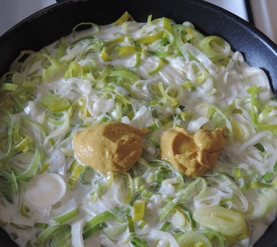 1Dans une poêle chaude, avec l'huile cuire les rondelles de poireaux pendant 5 min. Ajouter la crème liquide, la moutarde, du sel et du poivre et laisser épaissir pendant 10 min.