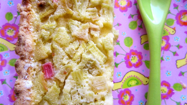 Tarte à la rhubarbe sur une base de pâte sucrée croustillante.