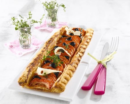 Disposez harmonieusement les tomates sur la pâte brisée, parsemez d'olives noires et d'herbes de Provence. Assaisonnez.