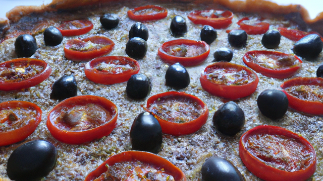 Couper les tomates en tranches, bien les ranger par dessus, ajouter de l'origan, des olives noires, arroser d'un peu d'huile d'olives, mettre au four à 200°.