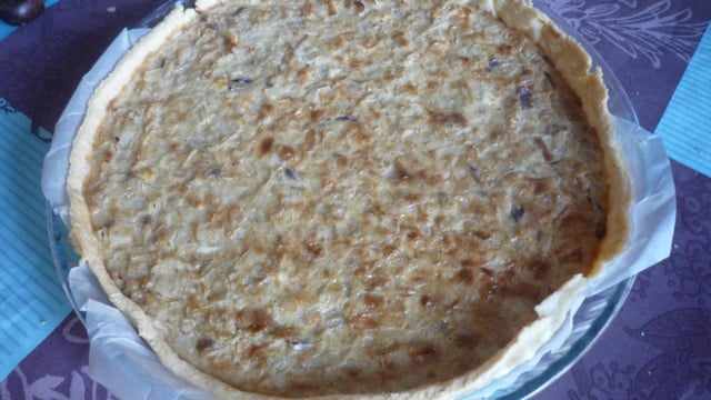 Retirer la poêle du feu. Ajouter les œufs et la crème fraiche, saler et poivrer. Transvaser sur la pâte brisée préalablement cuite. Enfourner à 240°C pendant 45 min.