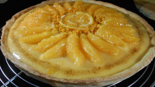 Disposer la crème refroidie dans le fond de tarte refroidi. Disposer les lamelles d'oranges, et les napper de marmelade d'oranges liquéfiée. Parsemer de zeste d'oranges pour décorer.