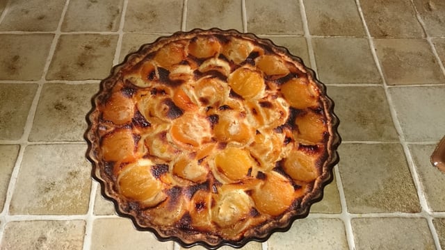 Piquer la pâte avec une fourchette. Verser la préparation précédente sur la tarte puis y disposer les moitiés d'abricots.