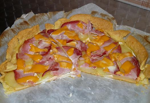 Une fois la pâte précuite, la recouvrir d'une couche de Cheddar (penser à garder quelques tranches pour le dessus de la tarte).