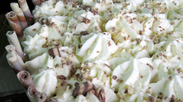 Décorer les bords avec les cigarettes. Fouetter en fleurette la crème fraîche avec le sucre glace à plaisir. Saupoudrer la surface avec les cigarettes restées émiettées. Réserver au frigo quelques heures.