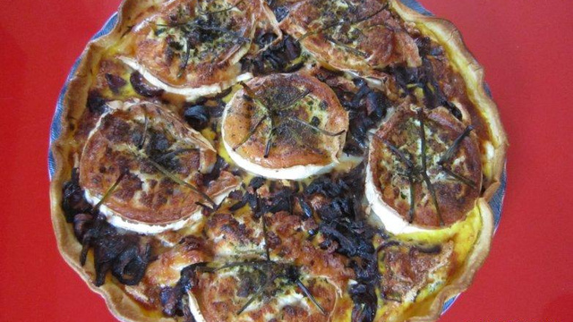 Tarte au chèvre agrémenté par des oignons rouges, du gruyère râpé, de la ciboulette, et de la crème fraîche.