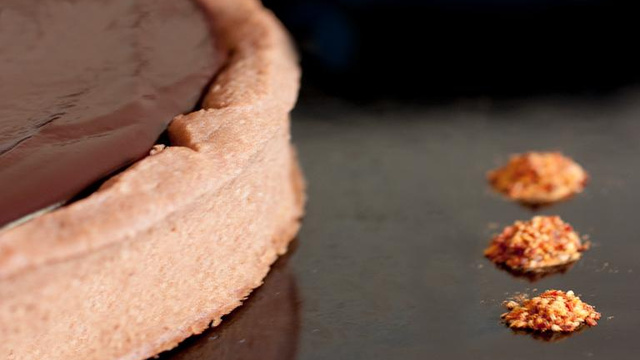 Dans un saladier, mélangez le beurre en pommade avec le sucre glace tamisé, le cacao, la levure et la poudre d'amandes. Ajoutez l'oeuf puis terminez par la farine. Ne travaillez pas trop la pâte. Enveloppez-la dans du film alimentaire et placez là 1 heure au congélateur pour pouvoir ensuite la manipuler sans soucis. Beurrez un disque de 24 cm de diamètre et posez le sur une plaque recouverte de papier cuisson. Étalez la pâte sur une épaisseur de 3mm et découpez y un disque de la taille du cercle. - 2
