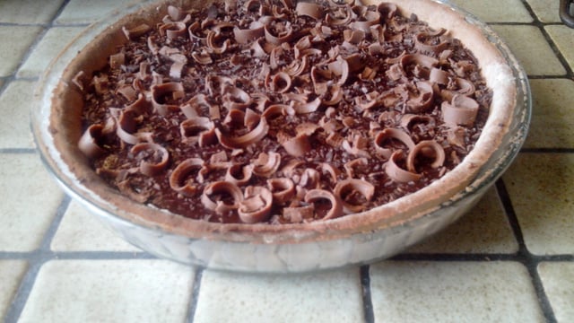 Mélangez puis versez 50ml de crème sur le chocolat, mélangez et recommencez avec le reste de la crème. Garnir le fond de tarte de ganache de chocolat et réserver au frais pour raffermir la ganache. Décorer de copeaux de chocolat. Bon appétit.