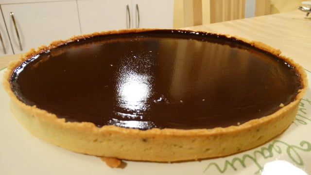 Une tarte au chocolat qui brille de mille feux. Un régal pour les yeux comme pour les papilles.