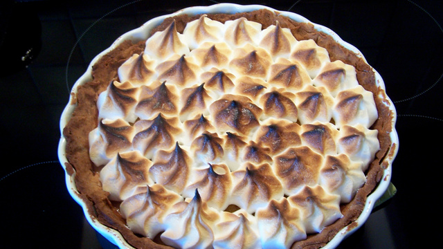 - 3La meringue :Battez les blancs en neige assez ferme et incorporez-y petit a petit le sucre en continuant de battre. Versez sur la tarte et étalez bien la meringue sur toute la surface (ou à la poche à douille). Passez la tarte sous le grill et surveillez jusqu'à coloration de la meringue.