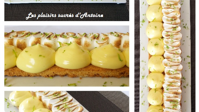 Coupez votre pate sablée au couteau à pain afin de ben régulariser les bords. Pochez la meringue sur la pate sablée. Grillez la meringue à votre guise à l'aide d'un chalumeau. Pochez la crème au citron. Parsemez de zests de citron vert.