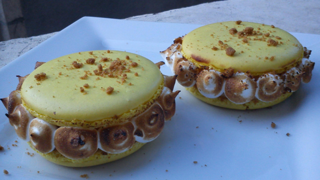 Il s'agit d'un macaron garni d'une crème au citron, d'éclats de sablés Spéculoos et d'une meringue italienne dressée à la poche à douille, brûlée au chalumeau.